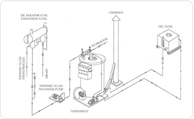 In Thermbest, there are two differently sized helical shaped seamless tube coils, with the gaps between their turns closed. These two coils are placed concentrically inside a cylindrical shell. A fine jet of combustible fuel is sprayed inside the chamber formed by the inner coil and ignited. This results in combustion and the not flue gas thus formed is blown down by air from the top. The flue gas then passes from this chamber to the path between the two coils, then, between the outer coil and the shell enclosing it and finally goes to the exit. The Thermic Fluid is passed through is two coils where it absorbs heat energy from the flue gas. Then it is sent to the process where heating is required. After the heat energy is extracted at the process the Thermic Fluid is recycled to the Thermic Fluid Heater.